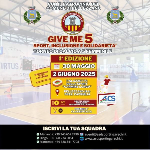Un evento sportivo che vuole essere molto più di una competizione. Dal 30 maggio al 2 giugno prossimi, presso il Palazzetto dello Sport “Carmine Longo” di Pellezzano, andrà in scena la prima edizione di “Give Me 5”, un torneo di calcio a 5 femminile organizzato dall’associazione sportiva dilettantistica Sporting Arechi con il patrocinio del Comune di Pellezzano e in collaborazione con il comitato provinciale dell’Aics Salerno.