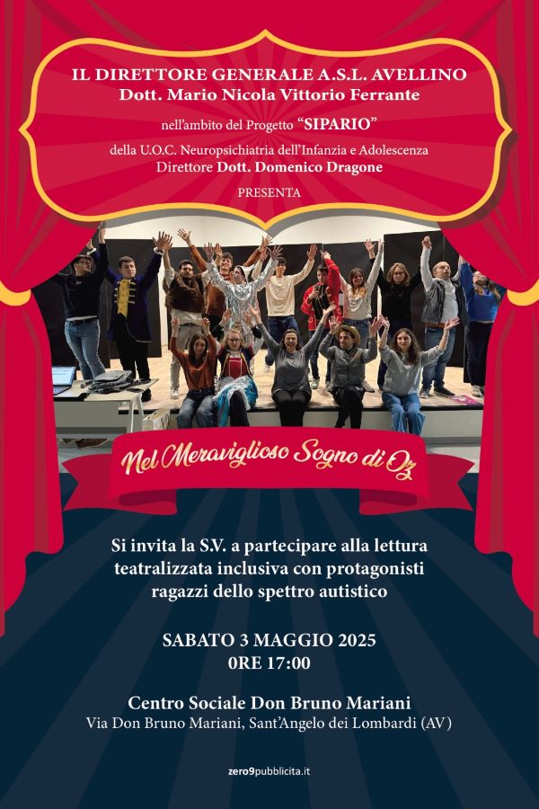 Si alza il sipario su “Il Meraviglioso Sogno di Oz” con protagonisti ragazzi con Disturbo dello Spettro Autistico. Appuntamento il 3 maggio alle ore 17.00 presso il Centro Sociale Don Bruno Mariani per lo spettacolo promosso dall’ASL di Avellino, diretta dal dott. Mario Nicola Vittorio Ferrante, nell’ambito del Progetto “Sipario” della UOC Neuropsichiatria dell’Infanzia e dell’Adolescenza, direttore dott. Domenico Dragone. Nove ragazzi autistici, a partire dai 13 anni, metteranno in scena, sotto la regia di Katia Cogliano, una lettura teatralizzata ispirata al celebre romanzo. Grazie alla sinergia tra ASL, RTI Autismo, Comune di Sant’Angelo dei Lombardi e al supporto dei terapisti e del personale ASL con i tecnici della riabilitazione psichiatrica Maria Carfagni e Rosa Gisonna, l’assistente sociale Maria Gatta e Antonio Nivone, è stato possibile sperimentare un percorso di crescita appassionante e inclusivo per ragazzi e ragazze impegnati alla scoperta del meraviglioso mondo del teatro.