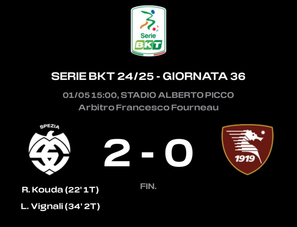 Nonostante i 1200 tifosi al seguito la Salernitana continua a soffrire nelle trasferte. Il match di oggi finisce 2-0 per i padroni di casa. Una vittoria meritata dello Spezia soprattutto per come i granata hanno affrontato la partita. Il mal di trasferta non si comprende dopo la buona prestazione nella giornata precedente. Lo Spezia segna un gol per tempo. Nei primi 45’con  Kouda, mentre il raddoppio è di Vignali. La Salernitana ci ha pure provato colpendo due pali. Sarebbe andata diversamente se la palla entrava. Il gol del vantaggio di Kouda nasce dal cross di Mateju dalla destra. Colpo di testa e palla in rete. Al quarto d’ora della ripresa è il palo a salvare lo Spezia sul diagonale di Ghiglione. Sempre il palo salva Gori, con Hrustic che calcia da dentro l’area su assist di Verde al 29′. Ma pochi minuti dopo è lo Spezia a raddoppiare. C’è un batti e ribatti in area; alla fine insacca Vignali che tira all’incrocio. Finisce 2-0 per i padroni di casa e purtroppo per i granata dagli altri campi non sono arrivati risultati positivi.