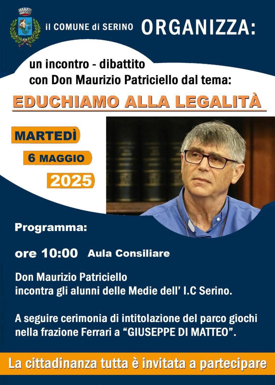 L’amministrazione comunale di Serino ospiterà martedì alle ore 10.00 Don Maurizio Patriciello, figura simbolo della lotta per la legalità e contro le mafie. La manifestazione dedicata all’educazione civica e alla giustizia si svolgerà  presso l’aula consiliare. Nell’occasione Don Patriciello incontrerà gli alunni dell’Istituto Comprensivo di Serino per un momento di confronto e riflessione. Subito dopo sarà nella frazione Ferrari per l’inaugurazione di un parco giochi dedicato alla memoria di Giuseppe Di Matteo, il ragazzo ucciso brutalmente dalla mafia.