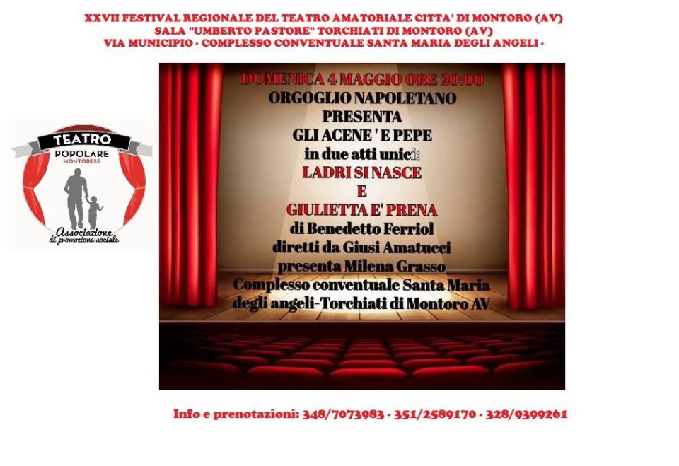 Questa stasera nel complesso monumentale di Santa Maria degli Angeli a Torchiati di Montoro, la XXVII edizione del “Festival Regionale del Teatro Amatoriale Città di Montoro”, organizzato dall’ “Associazione Teatro Popolare Montorese”, nella sala “Umberto Pastore” alle ore 20,00, presenta l’Associazione culturale “ORGOGLIO NAPOLETANO” e la compagnia teatrale “ACENE ‘E PEPE” di Giugliano in scena con due atti unici “LADRI SI NASCE” e “GIULIETTA E’ PRENA” regia di Benedetto Ferriol.