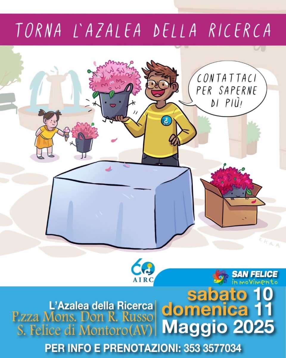𝐒𝐚𝐛𝐚𝐭𝐨 𝟏𝟎 𝐞 𝐝𝐨𝐦𝐞𝐧𝐢𝐜𝐚 𝟏𝟏 𝐦𝐚𝐠𝐠𝐢𝐨 in diverse piazze a Montoro. L’appello di “ San Felice in movimento”, che spiega, “bella, fiorita e profumatissima quest’anno è pronta ad 𝐢𝗻𝘃𝗮𝗱𝗲𝗿𝗲 𝗹𝗲 𝗽𝗶𝗮𝘇𝘇𝗲 𝐝𝐢 𝐌𝐨𝐧𝐭𝐨𝐫𝐨 𝗲 𝘀𝗼𝘀𝘁𝗲𝗻𝗲𝗿𝗲 𝗹𝗮 𝗿𝗶𝗰𝗲𝗿𝗰𝗮 𝗽𝗲𝗿 𝗶 𝘁𝘂𝗺𝗼𝗿𝗶 𝗰𝗵𝗲 𝗰𝗼𝗹𝗽𝗶𝘀𝗰𝗼𝗻𝗼 𝗹𝗲 𝗱𝗼𝗻𝗻𝗲! I nostri volontari e le nostre volontarie – spiega l’Associazione – ti aspettano in 𝐩𝐢𝐚𝐳𝐳𝐚 𝐌𝐨𝐧𝐬. 𝐃𝐨𝐧 𝐑𝐚𝐢𝐦𝐨𝐧𝐝𝐨 𝐑𝐮𝐬𝐬𝐨 sabato e domenica, proprio il giorno della Festa della Mamma per sostenere la ricerca sui tumori che colpiscono le donne. Cosa aspetti? Il futuro della ricerca è nelle nostre mani! Dai”. Per prenotare l’Azalea al 𝐜𝐨𝐬𝐭𝐨 𝐝𝐢 𝟏𝟖€, contattare l’Associazione al numero WhatsApp 353 357 7034. Fate un doppio regalo: alle nostre mamme e alla ricerca”.