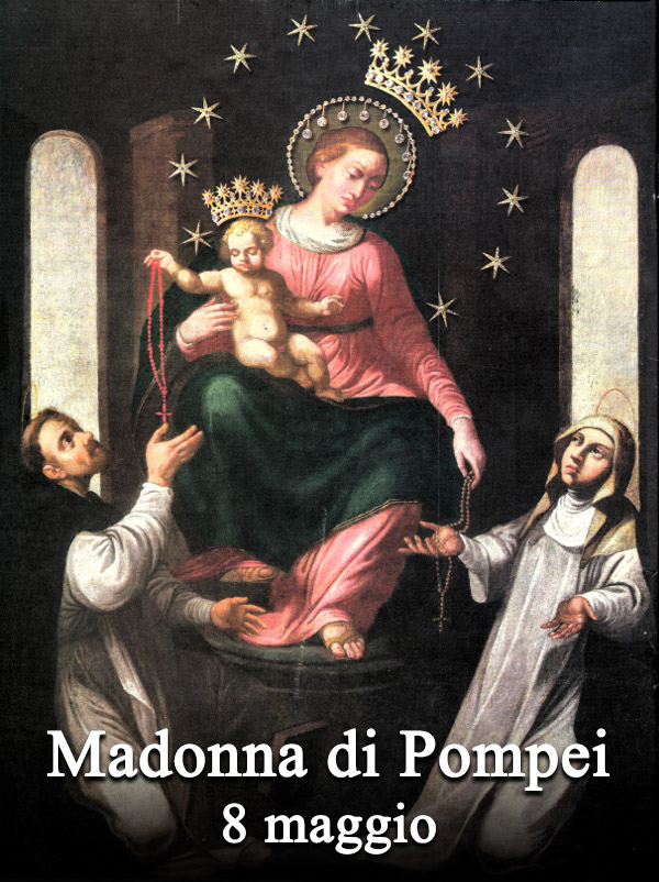 La devozione alla Vergine del Rosario di Pompei risale all’arrivo, come amministratore dei beni della contessa Marianna Farnararo vedova De Fusco, dell’avvocato Bartolo Longo, tra poco Santo. Il Beato Longo (dichiarato tale nel 1980) era tornato alla fede dopo un lungo periodo di crisi. Decise di propagare la preghiera del Rosario. Ricevette in dono un quadro raffigurante la Madonna in trono con Gesù Bambino sulle ginocchia, in atto di consegnare la corona del Rosario a santa Caterina da Siena e a san Domenico di Guzman. Il dipinto miracoloso, inizialmente conservato nella piccola chiesa parrocchiale, fu poi trasferito nella nuova chiesa, in seguito diventata Santuario e Basilica Pontificia. Al Santuario sono annesse numerose opere caritative, tutte ideate dal Beato Bartolo Longo, che la Chiesa, come detto, a breve dichiarerà Santo, come annunciato da Papa Francesco lo scorso 25 febbraio. I giorni che vedono il maggior afflusso di pellegrini a Pompei sono l’8 maggio e la prima domenica di ottobre, quando viene solennemente recitata la Supplica alla Vergine del Santo Rosario di Pompei, composta dallo stesso Beato Bartolo Longo e recitata anche dal Santo Padre appena scomparso.