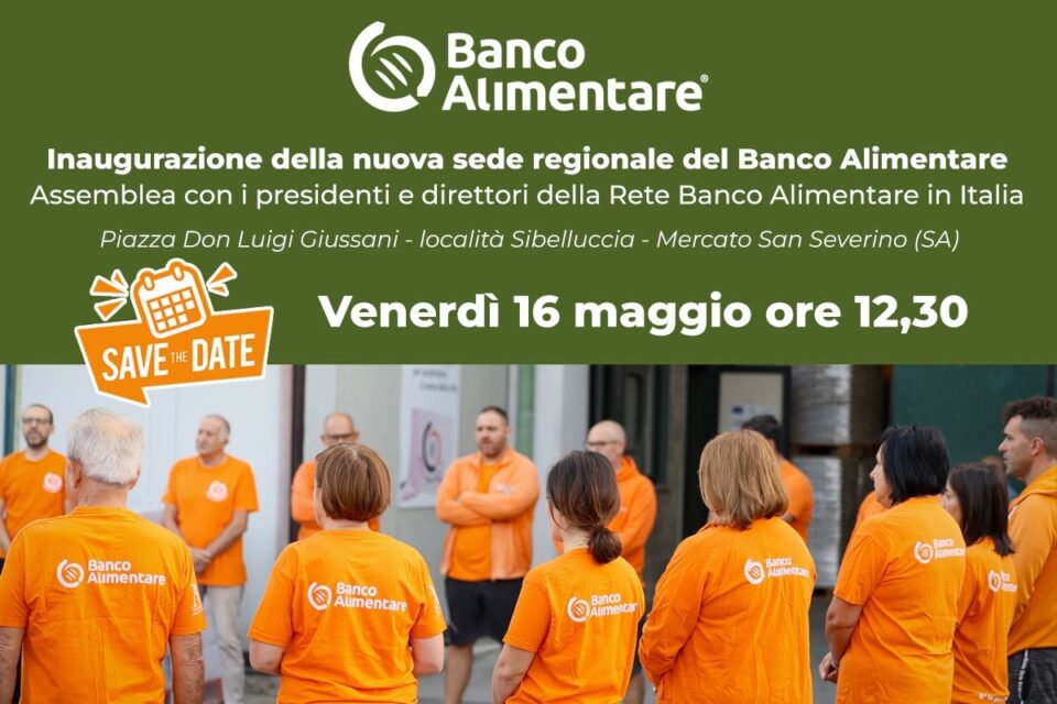 Venerdì alle ore 12:30 sarà inaugurata e benedetta la nuova sede regionale del Banco Alimentare Campania, in occasione dell’Assemblea Presidenti e Direttori d’Italia della Rete Banco Alimentare che, per la prima volta, si terrà in Campania. La nuova sede si trova a Mercato San Severino, in località Sibelluccia, a poca distanza dell’uscita del raccordo autostradale Salerno-Caserta. Partecipano alla manifestazione: Mons. Andrea Bellandi, Arcivescovo di Salerno; Fulvio Bonavitacola, Vicepresidente della Regione Campania; Antonio Somma, Sindaco di Mercato San Severino; Giovanni Bruno, Presidente nazionale della Fondazione Banco Alimentare; Roberto Tuorto, Direttore generale del Banco Alimentare Campania.