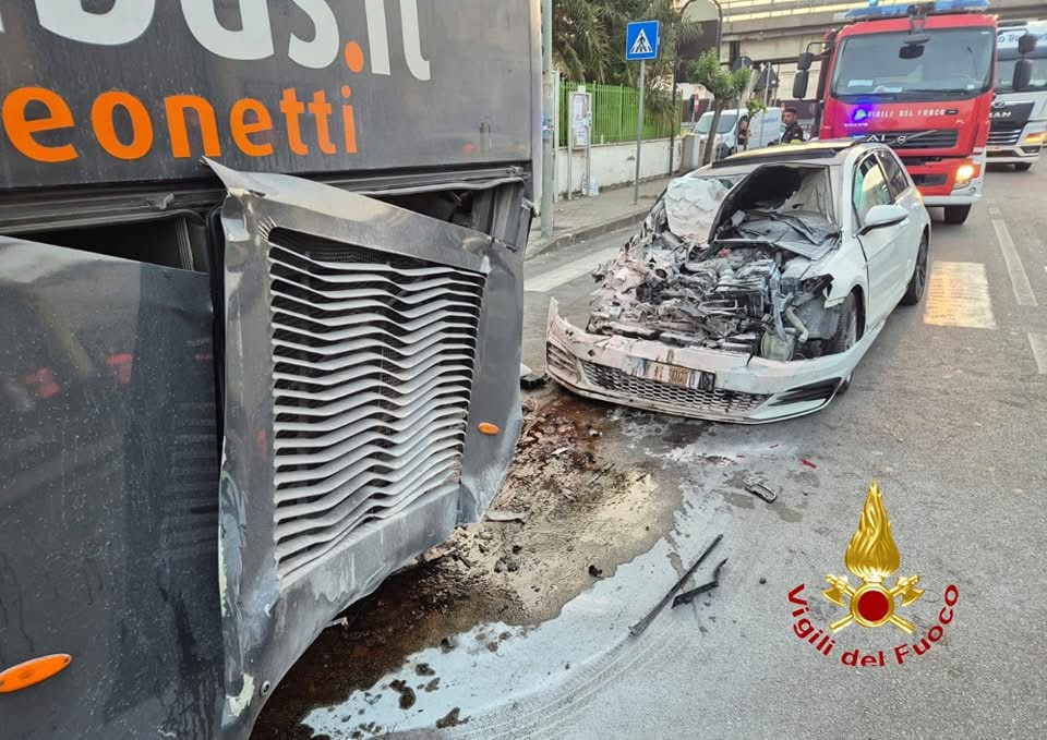 È successo poco dopo le 4.00 della notte appena trascorsa a Scafati. Per cause in corso di accertamento da parte dei carabinieri, una Volkswagen Golf in via Alessandro Manzoni è finita contro un bus. Un urto tremendo che ha distrutto l’auto e causato un principio d’incendio. Feriti i due occupanti soccorsi dal 118. Sul posto sono accorsi i vigili del fuoco che hanno domato un principio di incendio sprigionatosi dal veicolo.