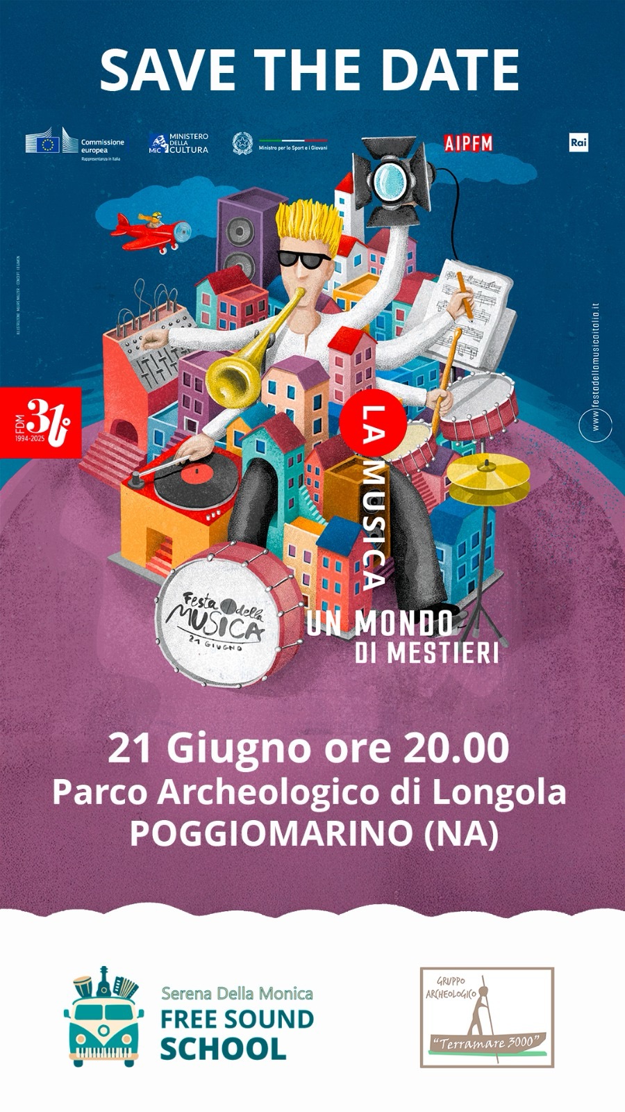 770 città,1273 eventi,14450 artisti, questi i numeri della 31° edizione Festa della Musica, in programma Il 21 giugno 2025, in tutta Europa ed anche a Poggiomarino presso il Parco Archeologico Naturalistico di Longola con il tema “I MESTIERI DELLA MUSICA”, dedicata alle diverse opportunità professionali che il mondo della musica offre. Longola è un’area archeologica situata a Poggiomarino, nella città metropolitana di Napoli, nella valle del Sarno, ad est del Vesuvio. Gli scavi hanno messo alla luce un villaggio dell’età del bronzo, costruito su degli isolotti artificiali affiancati da canali navigabili in un’area paludosa. L’ambiente anaerobico ha permesso agli archeologi di ritrovare l’intera struttura degli isolotti e alcune piroghe in legno in un ottimo stato di conservazione.Dal febbraio 2018, il Parco Archeo-Fluviale di Longola è visitabile, che ospita una ricostruzione di alcune capanne protostoriche del villaggio protostorico della popolazione dei Sarrasti.L’edizione della “Festa della Musica” a Poggiomarino organizzato dall’Associazione “Terramare 3000” che gestisce il Parco Archeologico Naturalistico di Longola e che aveva condotto la battaglia per la salvaguardia e la tutela del sito archeologico di Longola, scoperto nell’ottobre del 2000 e minacciato di distruzione dalla realizzazione di uno dei depuratori del medio Sarno. Esso si è assunto il compito di individuare, accertare, tutelare e valorizzare i siti archeologici della Valle del Sarno; di divulgare le conoscenze ad essi relative e di promuoverne la fruizione,vede la direzione Artistica dl M° Serena della Monica della “Free Sound School” coorganizzatrice dell’evento.La serata del 21 giugno con inizio alle 21.00 vedrà la partecipazione di tanti talenti musicali emergenti ,che ,all’unisono con tutte le città europee,daranno vita ad uno spettacolo che si ripete dal 1976, anno della sua invenzione .Tutto ebbe inizio nel 1976, esattamente il 21 giugno. A Joël Cohen, musicista americano,  sorse il desiderio di rendere omaggio al solstizio d’inverno (21 dicembre) e al solstizio d’estate (21 giugno).Quell’anno, mentre lavorava in radio, decise quindi di organizzare la sua programmazione musicale attorno a questi due momenti speciali dell’anno.Cohen decise di chiamare il suo progetto “Saturnales de la Musique”, che a tutti gli effetti rappresentò la premessa di quella che diventerà la Festa della Musica.Gli artisti emergenti che si esibiranno sul palco naturale del Parco Archeologico Naturalistico di Longola saranno :