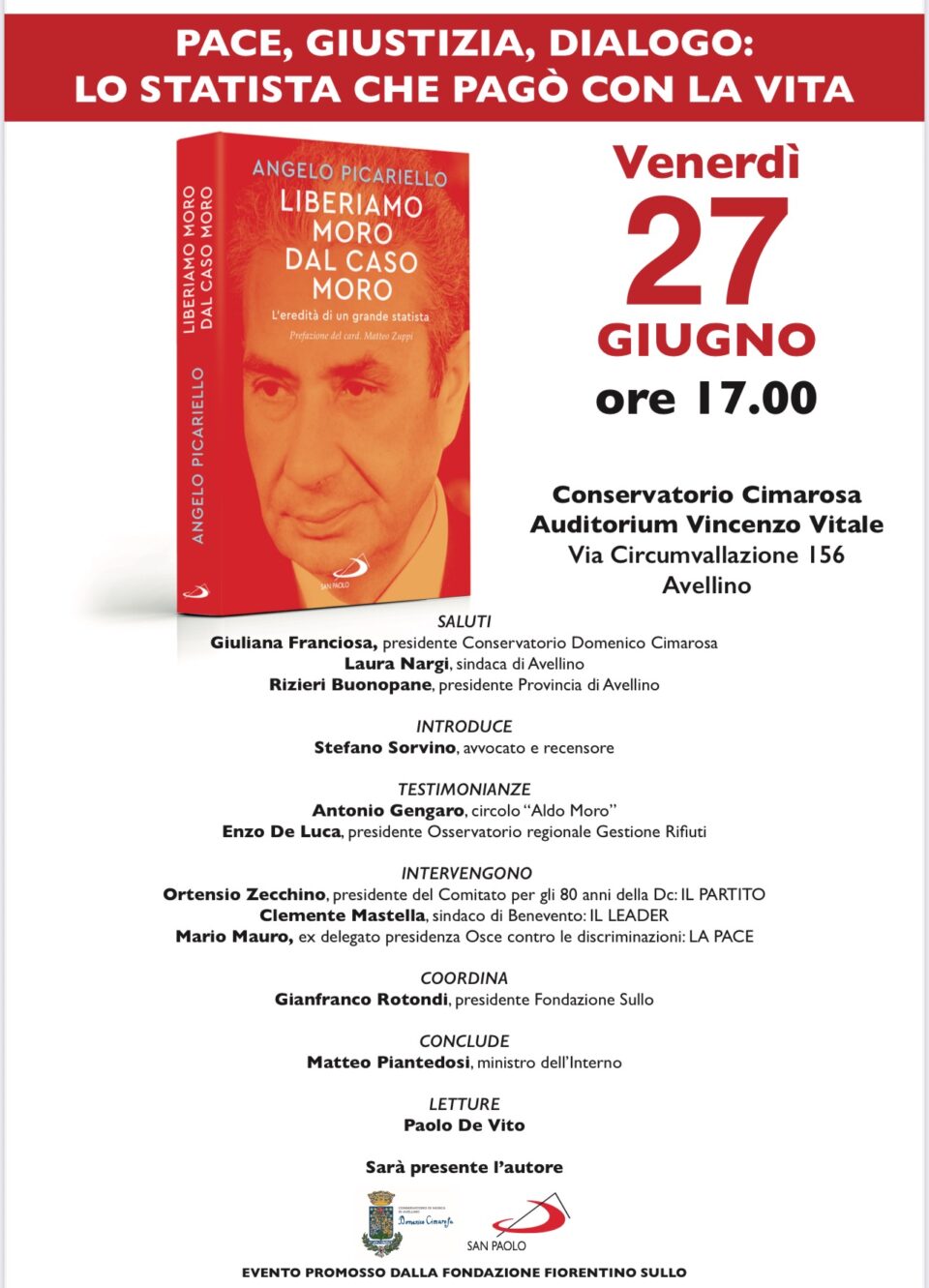 Promosso dalla fondazione Fiorentino Sullo, in collaborazione con le edizioni San Paolo e il Conservatorio Domenico Cimarosa, si terrà domani, 27 giugno, con inizio alle ore 17, presso l’auditorium Vincenzo Vitale, del Conservatorio l’incontro PACE, GIUSTIZIA, DIALOGO: LO STATISTA CHE PAGÒ CON LA VITA di presentazione del libro Liberiamo Moro dal caso Moro, del giornalista di Avvenire Angelo Picariello. Dopo i saluti della presidente del Conservatorio Giuliana Franciosa e delle istituzioni locali, coordinati dal presidente della fondazione Sullo, il deputato Gianfranco Rotondi, e introdotti dall’avvocato Stefano Sorvino, in qualità di recensore del volume, ci saranno le testimonianze del senatore Vincenzo De Luca, presidente dell’Osservatorio regionale sui rifiuti e del consigliere comunale Antonio Gengaro, del circolo Aldo Moro di Avellino; e l’intervento del sindaco di Benevento Clemente Mastella organizzatore di uno degli ultimi incontri pubblici, nel capoluogo sannita, dello statista pugliese, in cui tenne uno storico discorso. Prenderà poi la parola l’autore che, come si evince dal titolo, ha cercato con questo suo lavoro di rimettere al centro il Moro credente, giurista, costituente, docente e uomo di Stato, per evidenziare l’attualità di un pensiero offuscato dal racconto che resta confinato ai 55 giorni del rapimento. L’artista Paolo De Vitoleggerà alcuni testi di Moro.