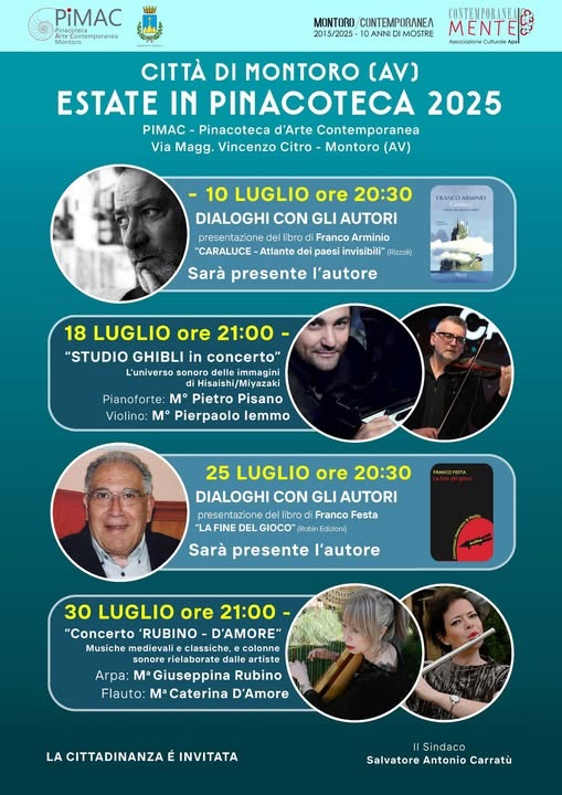 Un cartellone culturale di grande rispetto quello promosso dalla Pinacoteca d’Arte Contemporanea PiMAC – Montoro – commenta il primo cittadino Salvatore Carratu’ – insieme, all’Associazione Contemporaneamente diamo spazio all’arte e alla cultura come strumenti di crescita e di dialogo per la nostra comunità.
