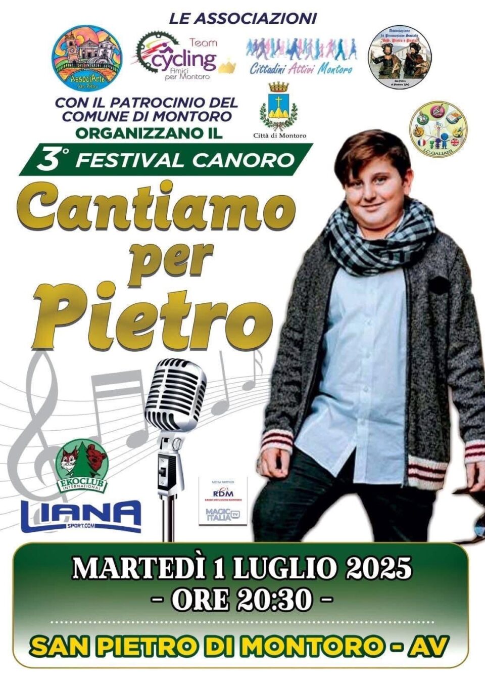 Stasera, alle ore 20:30, la frazione San Pietro di Montoro ospiterà la terza edizione del Festival Canoro “Cantiamo per Pietro”, un evento che, nel segno della musica e della solidarietà, rinnova il ricordo del piccolo Pietro Parrella e unisce l’intera comunità in un grande abbraccio collettivo.L’iniziativa, nata dalla sinergia tra le associazioni Cittadini Attivi Montoro, Team Cycling Amici per Montoro, AssociArte San Pietro, APS SS. Pietro e Paolo, vede quest’anno anche la partecipazione dell’associazione I Nodi d’Amore e dell’Istituto Comprensivo “A.F. Galiani” di Montoro.