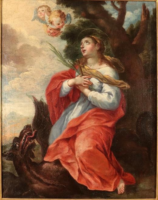 Nasce ad Antiochia di Siria nella seconda metà del III secolo da una coppia pagana. Viene educata alla fede cristiana dalla sua balia, una cristiana convinta. Il governatore Olibrio non solo cerca di distoglierla dal cristianesimo, ma vuole sposarla. Ella si rifiuta e così viene uccisa intorno al 305. E’ patrona dei contadini, delle partorienti e delle balie ed è invocata contro l’infertilità. Al governatore che la chiede in sposa, Margherita risponde di aver dedicato la sua vita a Gesù Cristo, il suo sposo celeste. ‘Puoi forse pretendere che io rinunzi al cielo e scelga invece la polvere della terra?’, gli dice. Olibrio, umiliato, dà ordine di bruciarle il corpo con fiaccole accese e di fustigarla. La leggenda vuole che alla prigioniera appaia un drago per sbranarla, che però scompare appena ella si fa il segno della croce. Anche le gravi ferite scompaiono miracolosamente. La notizia di questo miracolo si diffonde immediatamente tra il popolo suscitando scalpore, tanto che alcuni si fanno battezzare. L’ira del governatore non conosce allora più limiti e ordina che la giovane venga decapitata sulla pubblica piazza.