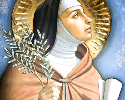 Nasce ad Assisi alla fine del XII sec., da una nobile famiglia dalla quale ha esempi di devozione e di carità. Mentre la scelta di orientare la sua vita totalmente a Dio si va maturando, Chiara incontro S. Francesco e con lui conclude la sua ricerca e inizia il tempo della vita monastica in S. Damiano, durato quarantadue anni. Per i molti anni della vita claustrale di Chiara è difficile trovare precisi dati cronologici e biografici, al di là dei singoli eventi, come per esempio l’assalto dei Saraceni al monastero, respinto miracolosamente, o l’assedio alla città di Assisi delle truppe imperiali guidate da Vitale d’Aversa. Sappiamo comunque che è una delle poche donne scrittrici sino al XIII sec. e la prima ad avere redatto una regola religiosa. Conosciamo la radicalità della sua scelta: il Vangelo di Cristo vissuto nella più grande semplicità e povertà, tanto da ottenere di inserire nella Regola il divieto per le ‘pauperes sorores’ di S. Damiano di acquisire beni immobili. Mantiene forti i legami con i frati della prima fraternità minoritica. E’ significativo infatti che, al momento della sua agonia, le siano accanto Ginepro, Leone e Angelo, testimoni autorevoli delle origini dei francescani minori. Chiara muore l’11 agosto 1253.