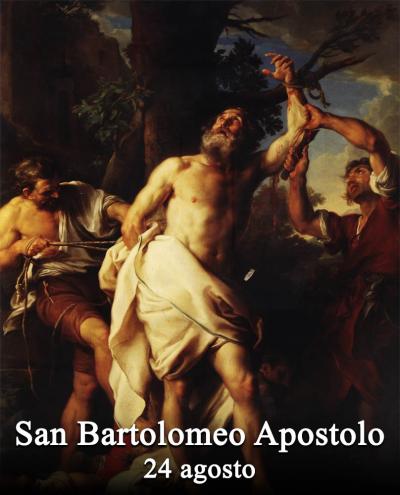 L’apostolo S. Bartolomeo era galileo e probabilmente pescatore come la maggior parte degli Apostoli. Scelto da Gesù, Natanaele, il suo nome originario. Insieme con gli altri Apostoli, predicò il Vangelo nella Giudea, operando miracoli e cacciando i demoni dagli ossessi. Nel giorno di Pentecoste ricevette egli pure la pienezza dello Spirito Santo, dopo di che annunziò intrepidamente il S. Vangelo agli Ebrei e soffrì come gli altri Apostoli obbrobri e battiture per amore di Gesù Cristo. Rigettato dai Giudei, S. Bartolomeo si portò prima nella Libia, poi nell’Arabia, nelle Indie Orientali e nell’Armenia Maggiore. La sua parola, congiunta ad una vita mortificata e allo spirito di preghiera, operò un bene immenso. Celebre è specialmente la conversione del re Polimio e della regina sua consorte. Però tanto zelo eccitò la gelosia e il furore degli idolatri, i quali, spinti da odio diabolico, tramarono contro di lui. Per meglio riuscire nel sacrilego intento, attirarono dalla loro parte il fratello del re, Astiage, che incatenato il santo Apostolo lo condannò ad essere scorticato vivo. Mentre essi compivano quest’opera, San Bartolomeo scongiurava il Signore perché volesse perdonare ai suoi carnefici. I manigoldi, dopo avergli tolta la pelle, lo decapitarono. Il corpo del santo Apostolo venne seppellito in Albanopoli, ove restò fino a quando l’imperatore Ottone II lo fece trasportare a Roma. Gli fu edificata una chiesa nell’Isola Tiberina e il suo corpo si trova sotto l’altar maggiore, in un sarcofago di porfido.