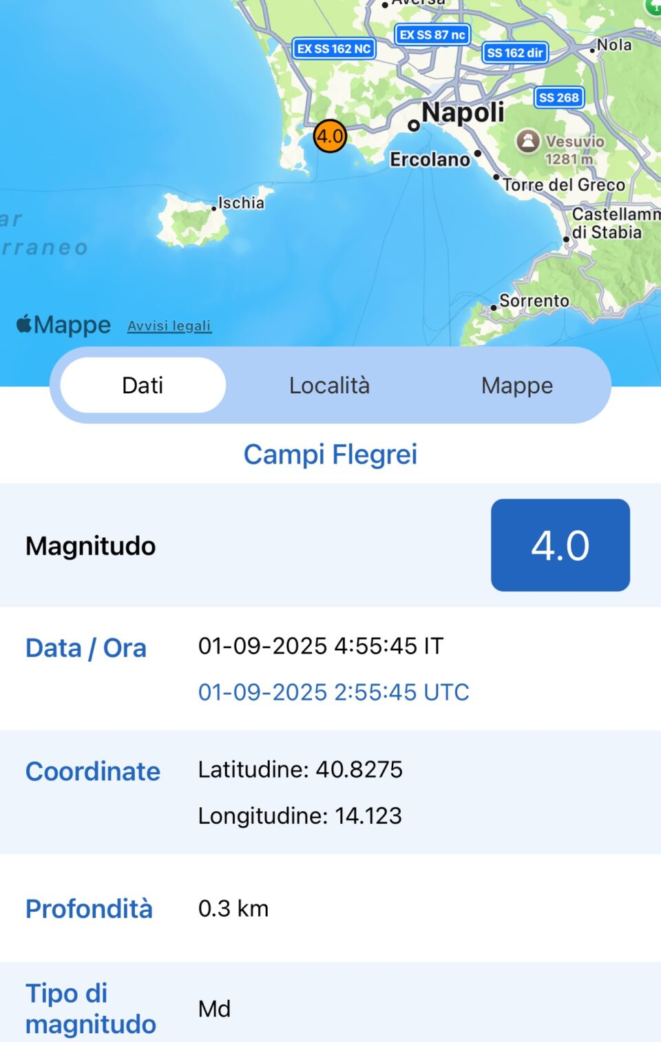 Forte scossa di terremoto di magnitudo 4 ai Campi Flegrei. L’evento è stato registrato alle 4:55. Secondo i dati dell’Istituto nazionale di geofisica e vulcanologia (Ingv), il sisma ha avuto ipocentro a meno di un chilometro di profondità ed epicentro vicino Pozzuoli. È la scossa più forte registrata dall’inizio di una nuova sequenza sismica in corso da ieri nella zona, che finora conta almeno 40 eventi sismici di cui 23 nella giornata appena iniziata.