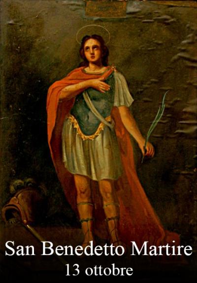 Il soldato Benedetto, del quale si ignorano le origini, non abiurò la fede cristiana e, secondo la storia tramandata nei secoli, venne decapitato il giorno 13 ottobre (304?) sul ponte del torrente Menocchia, e poi gettato nello stesso corso d’acqua per poi finire in mare. Qui, dopo aver percorso appena 4 miglia, finì su una spiaggia dove venne raccolto da un contadino che volle dargli degna sepoltura sul primo promontorio antistante. La tomba del martire divenne presto un luogo di culto e, attorno ad essa, nel tempo, si formò il nucleo originario dell’attuale San Benedetto del Tronto. Le spoglie del santo sono conservate nella chiesa e nel 2003 (diciassettesimo centenario dalla morte) sono state oggetto di una radiodatazione ad opera dell’Università del Salento che ha confermato, pur entro un intervallo di più o meno 50 anni, dettato dai limiti di precisione di questo tipo di indagine, che le ossa che ancora si conservano sono da attribuirsi ad un uomo morto verso il 300 d.C.