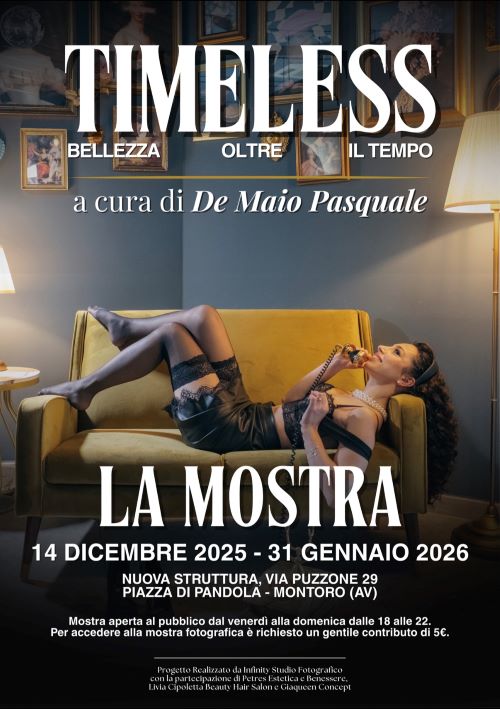 “Ho voluto realizzare Timeless come omaggio al gran maestro Vincent Peters – commenta Pasquale De Maio – Il focus principale di questi shooting è quello di rivitalizzare location vintage del territorio, immortalando quelle sfumature dell’animo femminile a cui tanto dovremmo affezionarci e donare rispetto e a cui tanto dovremmo innalzare inni mentre troppo spesso accade il contrario”. La mostra sita in via Puzzone, 29 sarà aperta dal venerdì alla domenica dalle 18.00 alle 22.00, fino al 31 gennaio 2026.