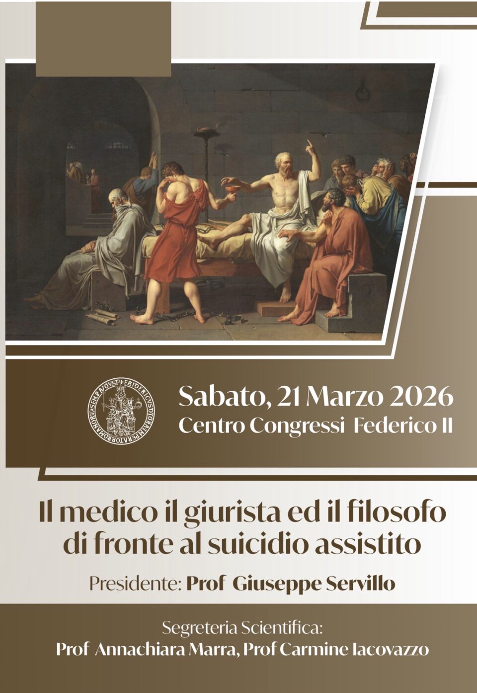 Il tema del suicidio assistito sarà al centro di un’importante giornata di studio e confronto interdisciplinare in programma sabato 21 marzo 2026 presso il Centro Congressi Federico II di Napoli. Il convegno, dal titolo «Il medico, il giurista ed il filosofo di fronte al suicidio assistito», riunirà medici, giuristi e filosofi di primo piano per un’analisi approfondita delle implicazioni etiche, cliniche e giuridiche di una delle questioni più delicate e divisive del dibattito pubblico contemporaneo.