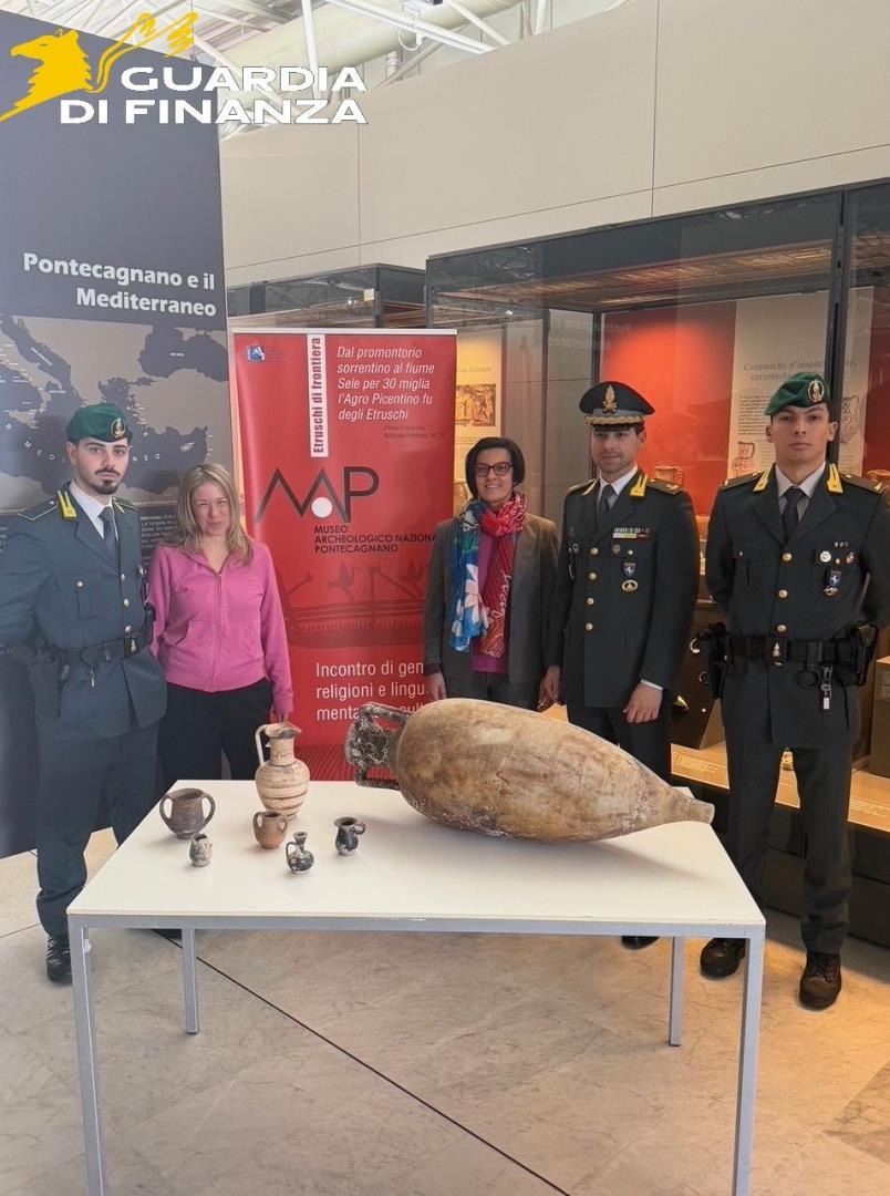 Sono stati recuperati a patrimonio dello Stato e restituiti ai cittadini reperti che vanno ad arricchire il già notevole patrimonio archeologico attualmente conservato ed esposto presso il Museo Archeologico Nazionale di Pontecagnano, rientrante tra i siti gestiti dalla Direzione Regionale Musei Nazionali Campania.